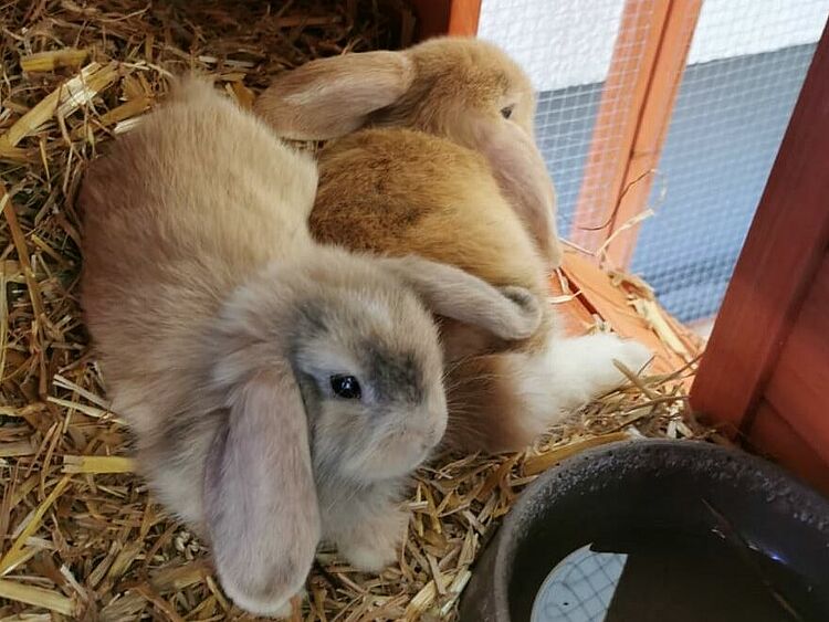 Die beiden Zwergwidderkaninchen haben einen großen Stall mit Freilauf, sowie ein gesondertes Gartengehege. Die Kinder können die Tiere von innen beobachten, bei der Stallarbeit helfen und auf dem Hochbeet für sie Karotten und Salat anpflanzen. Geburtstagskinder dürfen die Tiere auch streicheln.