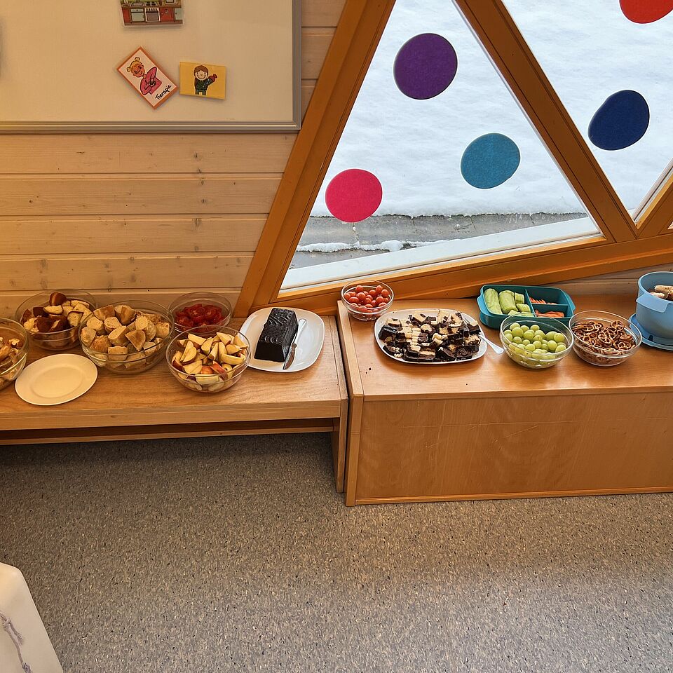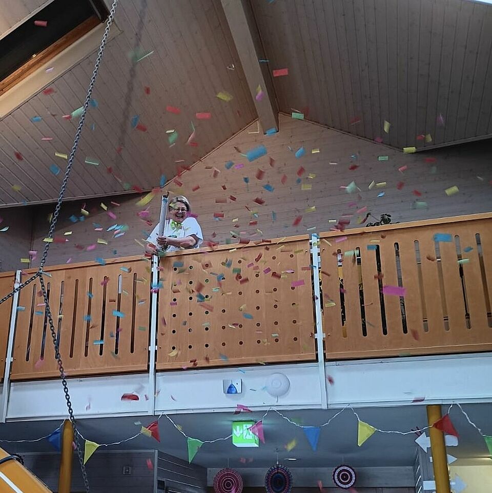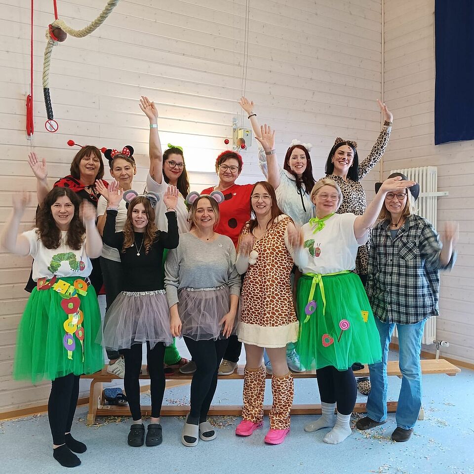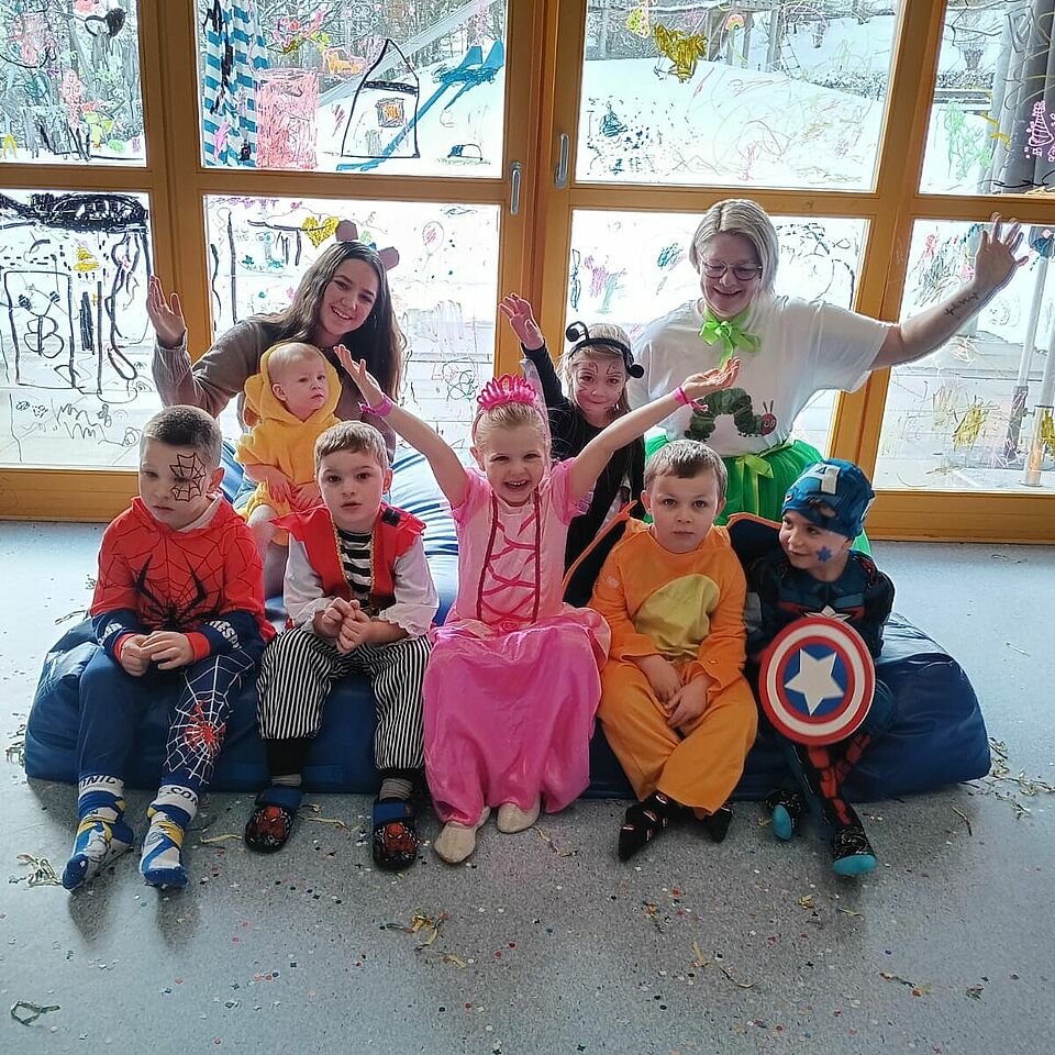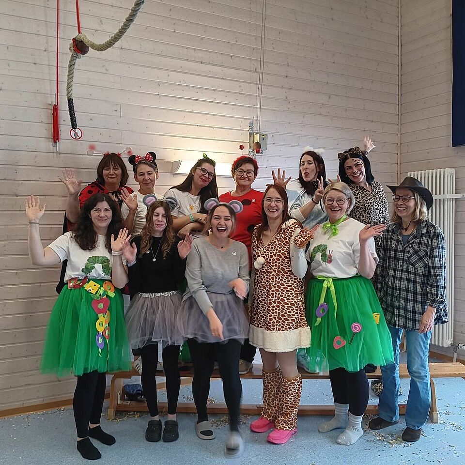 „Wir haben mit den Kindern heute schön gefeiert. Die Eltern hatten tolle Leckereien fürs Frühstücksbuffet mitgebracht und es gab verschiedene Bastelangebote, viel Konfetti und Faschingsmusik. Die Scheiben in der Turnhalle wurden letzte Woche schon bunt von den Kindern bemalt und natürlich durfte auch der Konfetti-Regen nicht fehlen. Wenn das Wetter morgen mitspielt, laufen wir mit einigen Kindern und Eltern auch beim Umzug in Gemünden mit.“