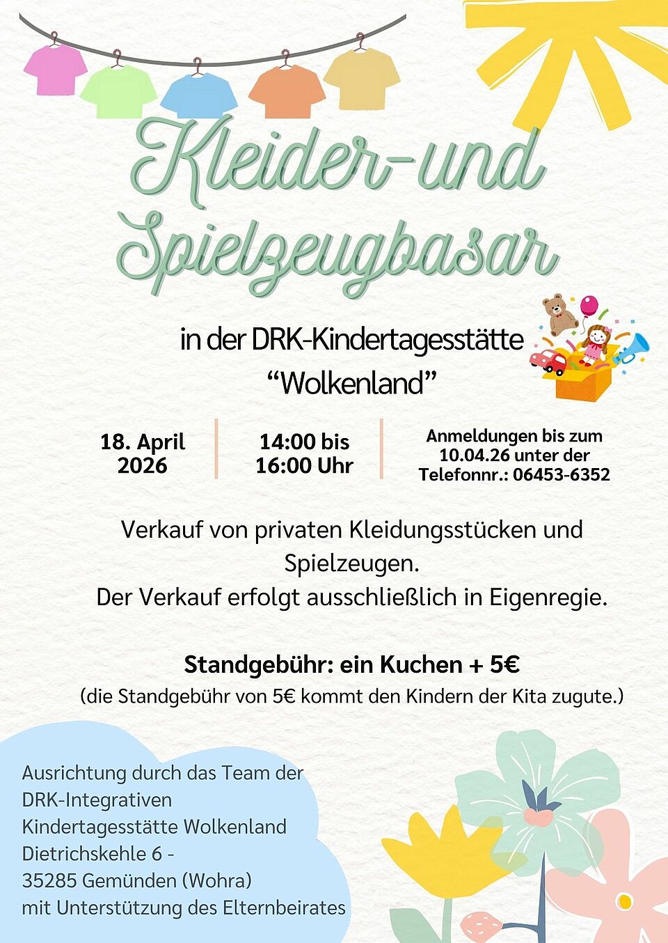 Die DRK-Kita Wolkenland lädt zum alljährlichen Kleider- und Spielzeugbasar ein. Bei unserem alljährlichen Basar können Sie Kinderkleidung, Spielzeug und viele schöne Dinge rund ums Kind kaufen oder selbst verkaufen.