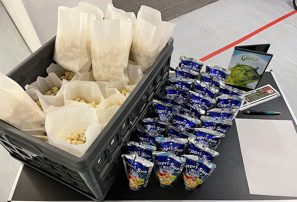 Der große Bewegungsraum wurde in einen gemütlichen Kinosaal verwandelt. Auf einer großen Leinwand konnten die Kinder den Film verfolgen und echtes Kino-Feeling genießen. Die lustige und zugleich herzerwärmende Geschichte des Grinch sorgte immer wieder für Lachen, Staunen und gespannte Aufmerksamkeit. Natürlich durfte auch das passende Kinoangebot nicht fehlen: frisches Popcorn und leckere Getränke standen für alle Kinder bereit und trugen zur guten Stimmung bei. Viele Kinder genossen es, mit Popcorn in der Hand den Film zu verfolgen und sich ganz auf das Kinoerlebnis einzulassen.
