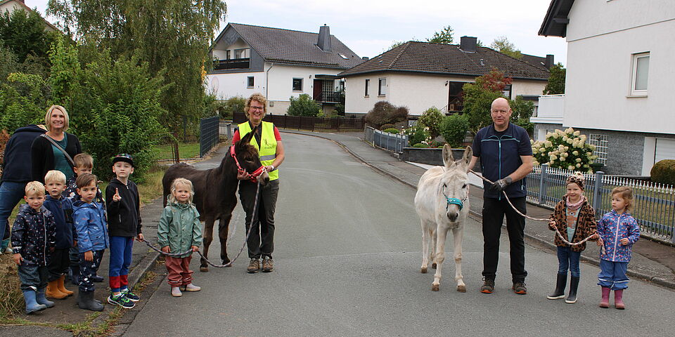 Kinder der DRK-Kita Wigand Gerstenberg waren zu Besuch bei den Eseln: Gemeinsam mit ihren Betreuungspersonen erfuhren sie im September bei Anja und Oliver Kewald in Röddenau alles über die Langohren. Zusammen wurden „Ole“ und „Diego“ geputzt, gefüttert und für einen gemeinsamen Spaziergang vorbereitet. Allen Zwei- und Vierbeinern hat es viel Spaß gemacht.